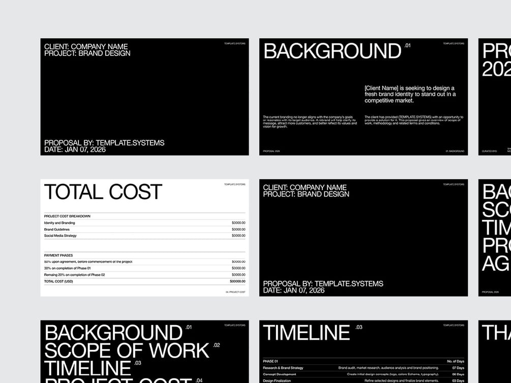 Send clear, confident and professional proposals that impress clients and win projects. This easy-to-use template is perfect for freelancers and small businesses.